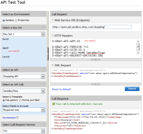 The API Test Tool has provided us with some valuable time saving information: It’s spelled out exactly what we need to pass into the eBay Shopping API service to request an eBay time response.