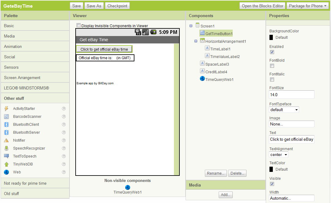 Since we’re sending the same sort of HTTP GET web API request and getting back the same sort of JSON response, we can in fact reuse a great deal of our example app from the second article, too. Let’s select and configure similar components to create our new GeteBayTime app. Here’s what it looks like in the App Inventor Designer once we’ve got all the components in place: